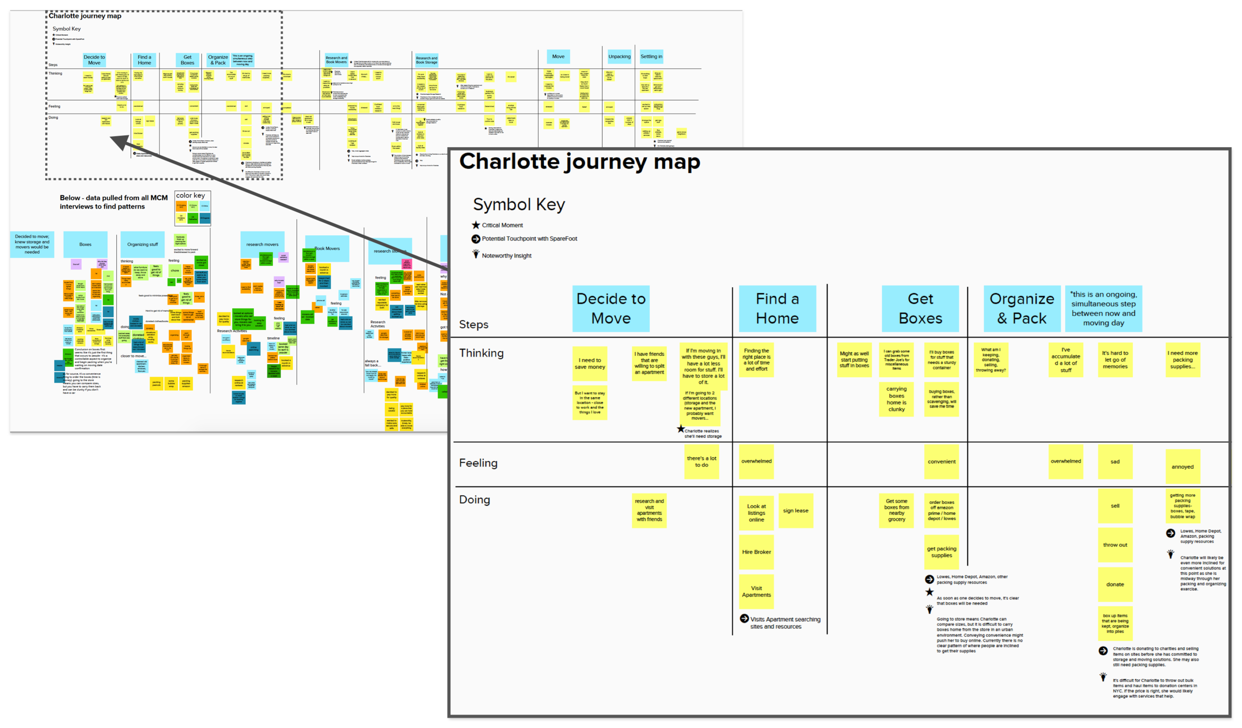 After we documented our findings we began to construct a narrative. A Senior UX Researcher and I mapped out Charlotte’s journey (seen below) by clustering each task she went through as she moved toward her main goal. We grouped the generalized thoughts, feeling and actions of all the interviewee’s and plotted them within each task.