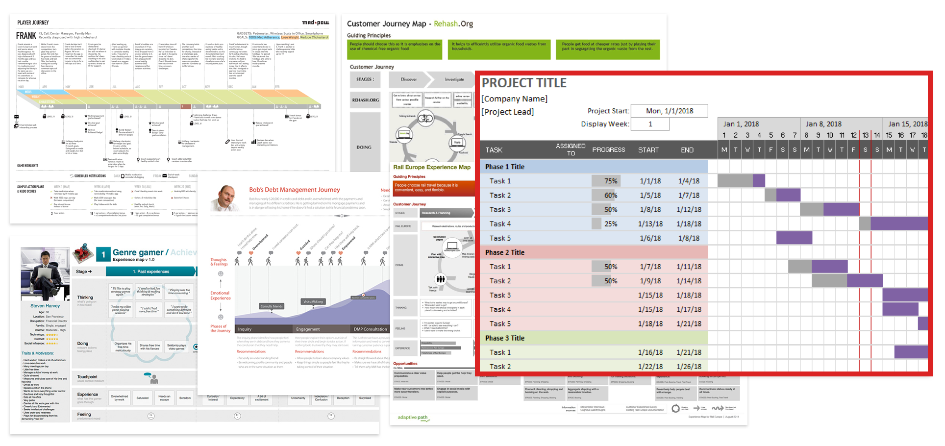 Inspiration examples of journey maps and a traditional gantt chart