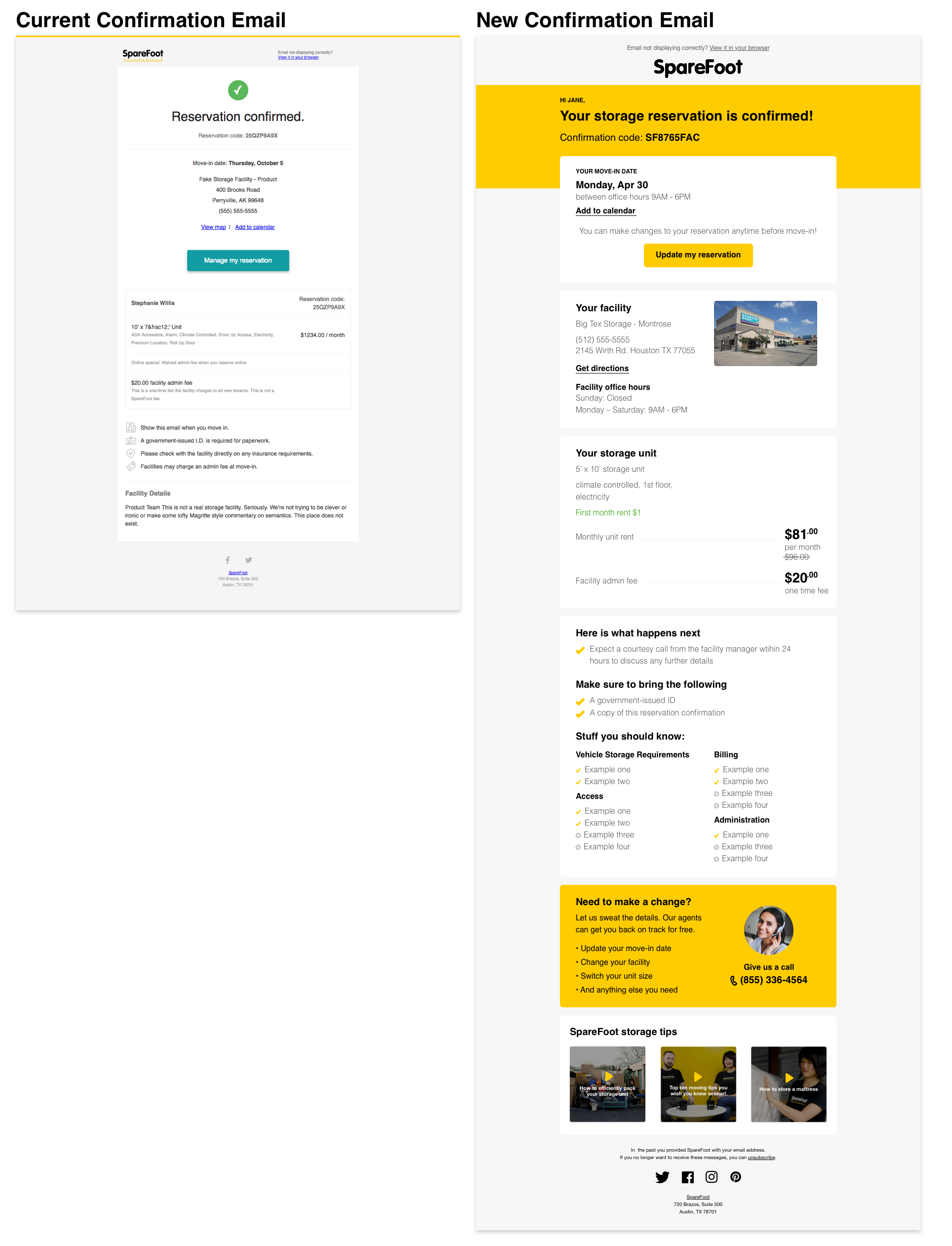 SF Confirmation Email_v1: People were not reading the introduction copy at the top so we removed most of it. We also noticed people were still not understanding that we were a storage marketplace, so we added messaging about our 11k partnerships.